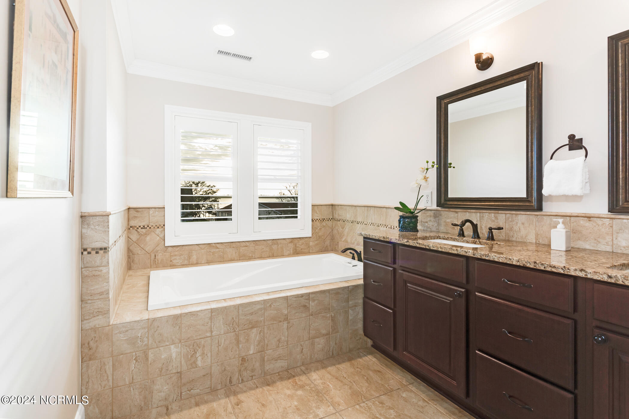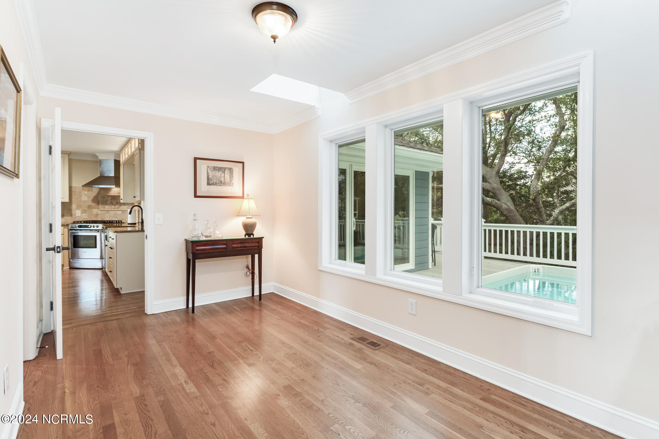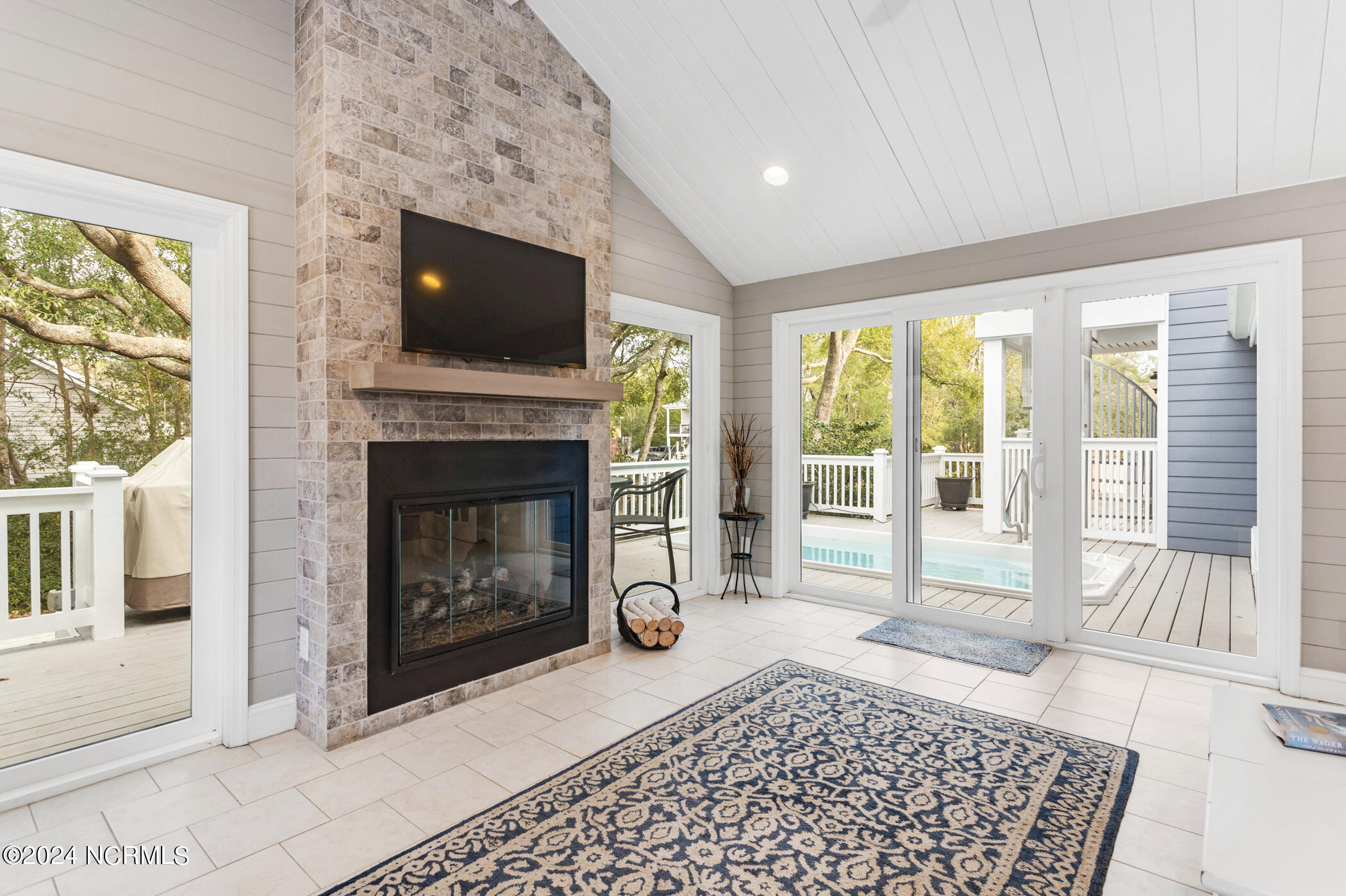 The heart of the home lies in the beautiful kitchen, featuring granite countertops, a gas cooktop, and an abundance of storage space. Adjacent to the kitchen, a sunroom with a cozy fireplace--a perfect retreat for year-round relaxation. Step outside to discover the heated saltwater soaking pool amidst sculpted landscaping and a private backyard oasis.